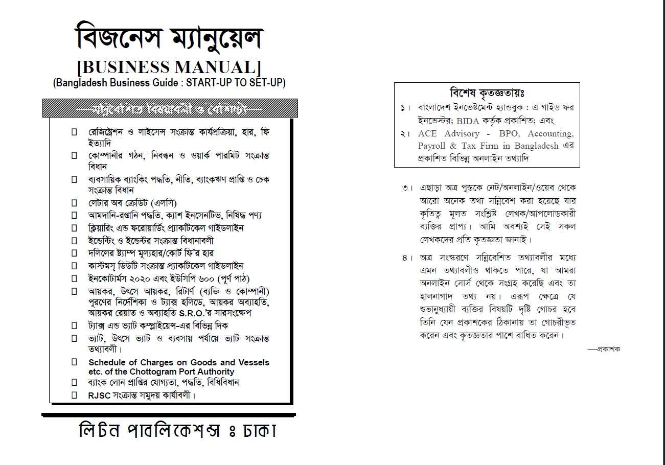 “Business Manual – Bangladesh Business Guide (Start-up to Set-up)” হলো বাংলাদেশের ব্যবসাভিত্তিক সবচেয়ে পূর্ণাঙ্গ একটি গাইডবুক।