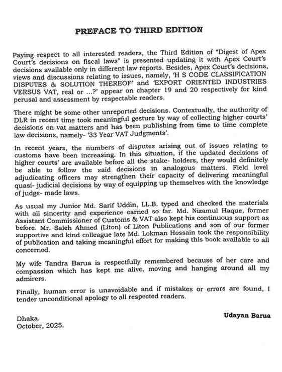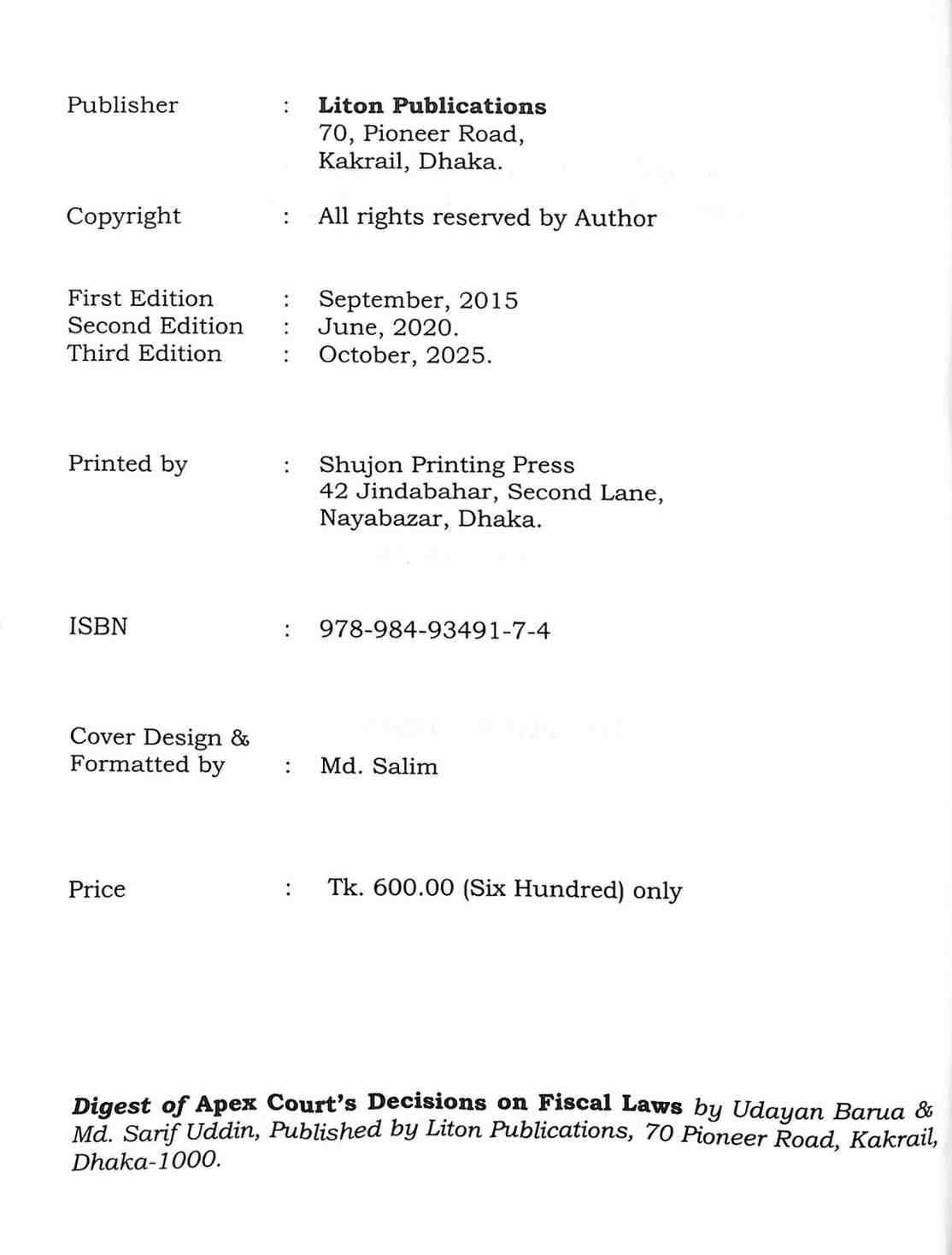 “Digest of Apex Court’s Decisions on Fiscal Laws” বইটিতে বাংলাদেশের Apex Court (Supreme Court)-এর আয়কর, ভ্যাট, কাস্টমস সহ সকল রাজস্ব আইন(fiscal law)সম্পর্কিত গুরুত্বপূর্ণ সিদ্ধান্তগুলোর সংক্ষিপ্ত সার ও বিশ্লেষণ উপস্থাপন করা হয়েছে। তৃতীয় সংস্করণে (October 2025) নতুন যুক্ত হয়েছে HS Code Classification Dispute এবং Export Oriented Industry vs VAT বিষয়ক রায়সমূহ। বইটি কর প্রশাসন ও আইন পেশার সাথে সম্পৃক্তদের জন্য অত্যন্ত উপযোগী।