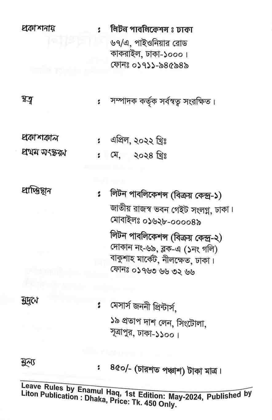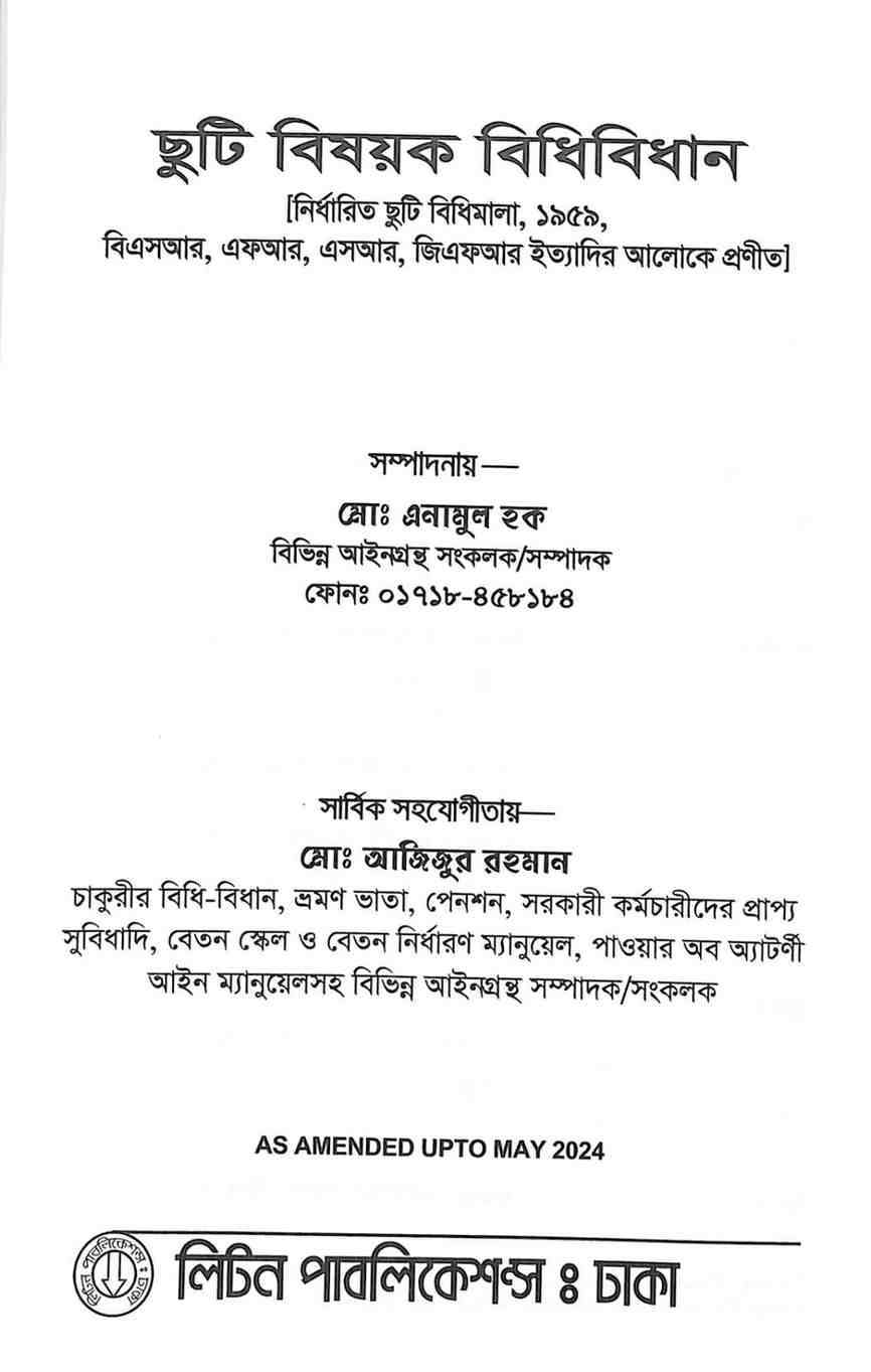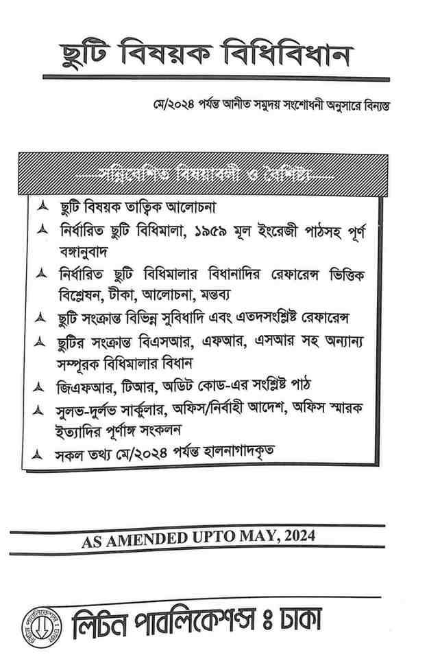 এই বইটিতে সরকারি ও বেসরকারি প্রতিষ্ঠানসমূহে ছুটি সংক্রান্ত যাবতীয় বিধি-বিধান সহজ ভাষায় ব্যাখ্যা করা হয়েছে। ছুটি আবেদন, অনুমোদন, বাতিল, ছুটি হিসাব সংরক্ষণ, ব্যালেন্সিং ইত্যাদি বিষয়াদির বিস্তারিত গাইডলাইন রয়েছে। এটি মানবসম্পদ ব্যবস্থাপনা, প্রশাসন বিভাগ, একাউন্টস অফিসার ও চাকরিপ্রার্থীদের জন্য একটি অপরিহার্য সহায়ক গ্রন্থ।