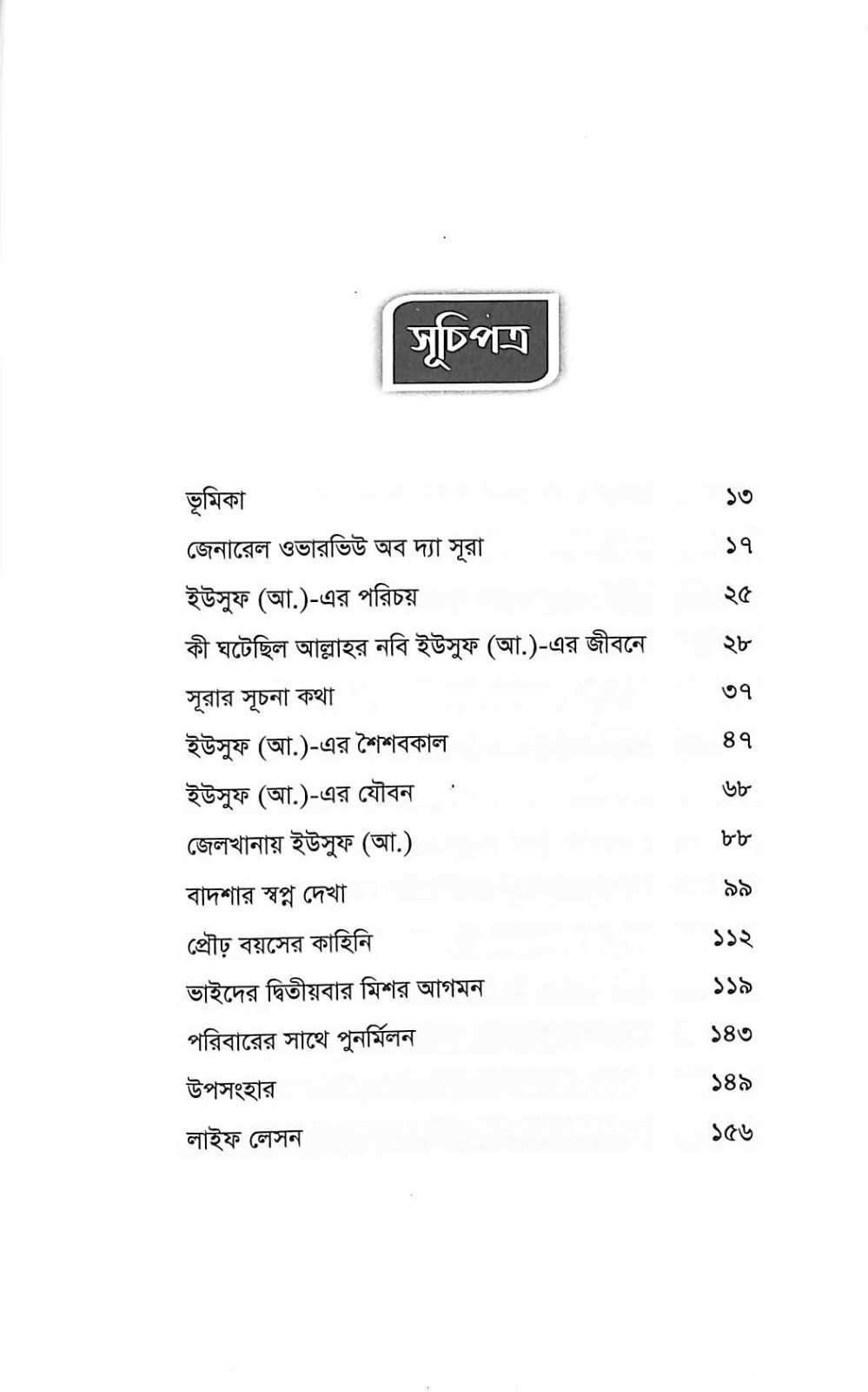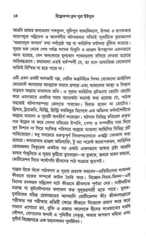 রিফ্লেকশন ফ্রম সূরা ইউসুফ গ্রন্থটি কুরআনের সূরা ইউসুফের আলোকে আধুনিক জীবনের বাস্তবতা, সংকট, ধৈর্য, নৈতিকতা ও আত্মশুদ্ধির গভীর ব্যাখ্যা তুলে ধরে। সূরা ইউসুফের ঘটনাবলিকে শুধু ইতিহাস হিসেবে নয়, বরং ব্যক্তি ও সমাজজীবনের জন্য বাস্তবিক দিকনির্দেশনা হিসেবে উপস্থাপন করা হয়েছে। এই বই পাঠকের চিন্তা, চরিত্র ও আত্মিক উন্নয়নে গুরুত্বপূর্ণ ভূমিকা রাখবে।