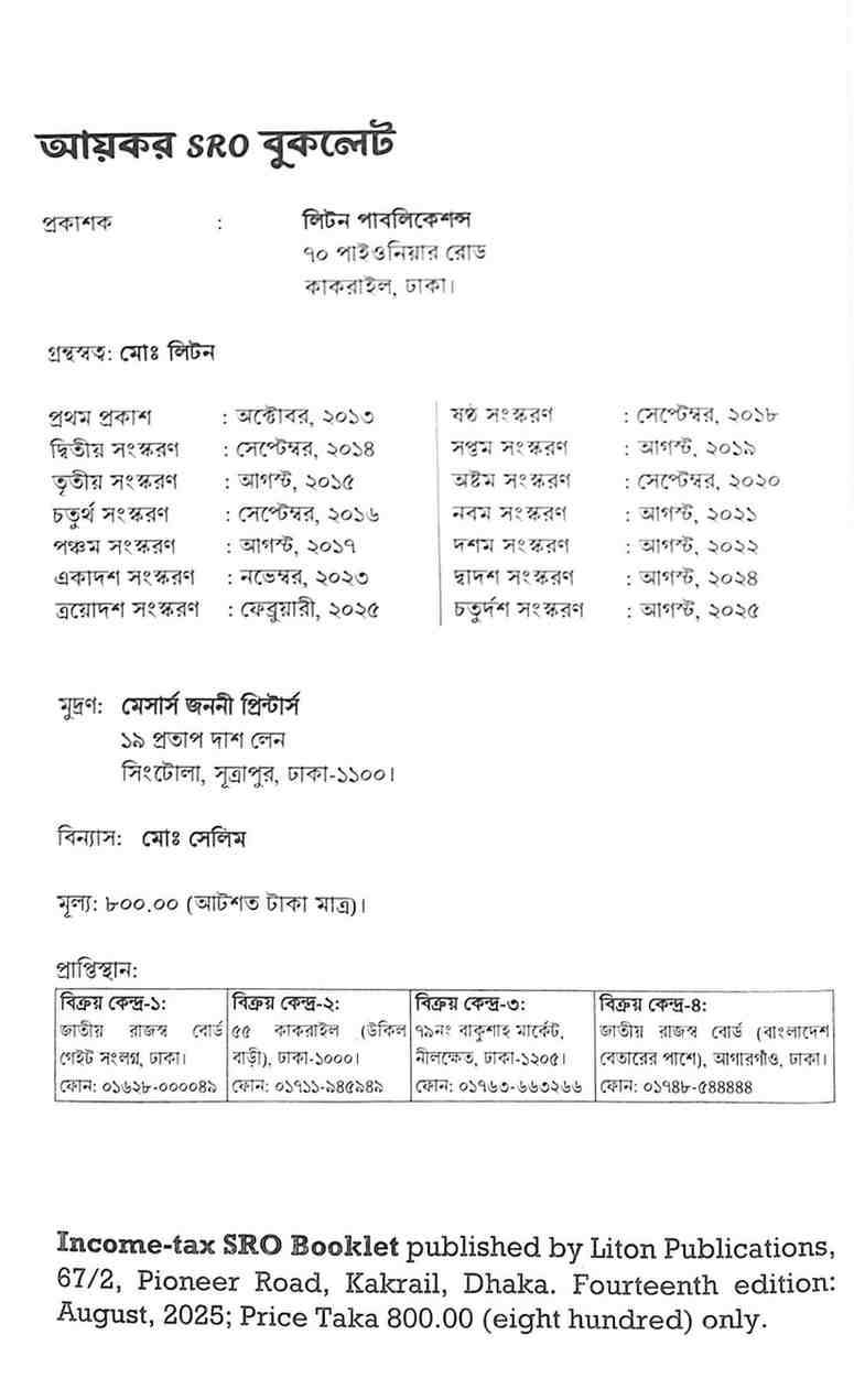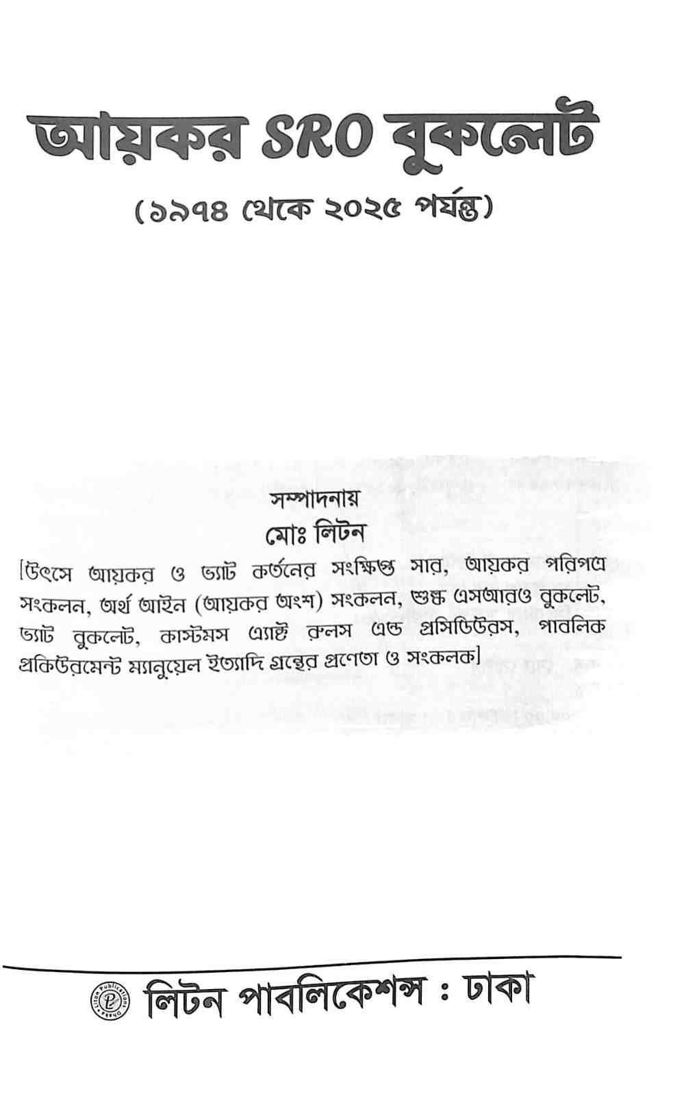"আয়কর SRO বুকলেট ২০২৫-২০২৬ একটি পূর্ণাঙ্গ সংকলন যা ১৯৭৪ থেকে ২০২৫ পর্যন্ত সন ভিত্তিক আয়কর ও SRO-এর বিভিন্ন বিধি এবং আইন সংকলিত হয়েছে। বইটি আয়কর আইন এবং SRO-র সাথে সম্পর্কিত গুরুত্বপূর্ণ তথ্য ও নির্দেশাবলী প্রদান করে, যা আয়কর পেশাদারদের এবং ব্যবসায়ীদের জন্য অত্যন্ত সহায়ক। বইটি সম্পাদনা করেছেন মোঃ লিটন এবং এটি লিটন পাবলিকেশন থেকে প্রকাশিত। এই বইটি আয়কর আইন ও SRO সম্পর্কিত বিশদ তথ্যের জন্য একটি গুরুত্বপূর্ণ রেফারেন্স।"