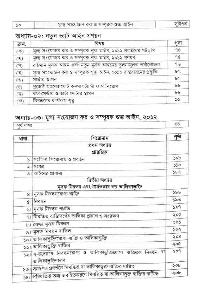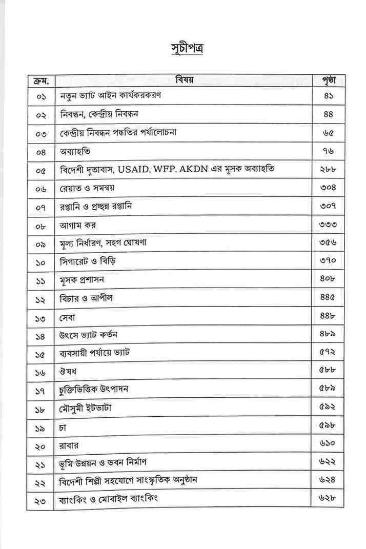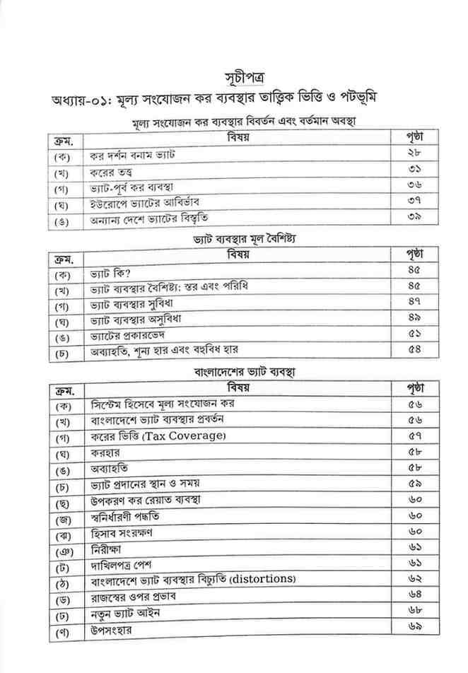 প্রথম খন্ডে ভ্যাট আইন ও বিধির সহজ ভাষায় ব্যাখ্যা দেয়া হয়েছে। তাছাড়া, ভ্যাট ট্রাইব্যুনাল এবং উচ্চ আদালতের ভ্যাট সংক্রান্ত মামলার রায়ের চুম্বকাংশ সংশ্লিষ্ট স্থানে পেশ করা হয়েছে।